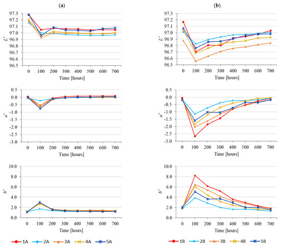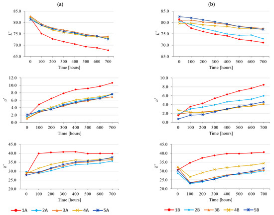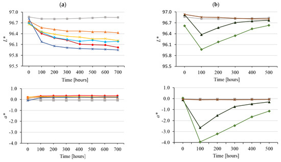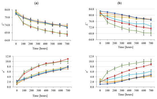 Accelerated-ageing-induced effects on L*, a*, and b* colour coordinate values obtained for wood coated with coating systems: (a) without lignin stabiliser and (b) with lignin stabiliser.