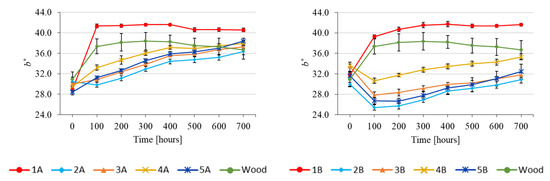 The values of colour coordinate, a*, before ageing ranged from 1 to 2.5, (close to achromatic). With progressing ageing time, these values increased, with a significant shift to a more saturated red colour. Also in this case, more obvious changes were observed in the coating systems where the top layer did not contain a UV absorber. The changes observed in this CS were practically the same as the changes obtained in spruce wood without surface treatment (Figure 5a). The values of coordinate, b*, which ranged from 28–31 before ageing, increased with the progressing ageing process. Also in this case, the most apparent change was observed in the coating system 1A, and this change was present within the first 100 accelerated ageing hours. Subsequently, there was no significant growth. Contrarily, after 400 ageing hours, a moderate decline could be detected. This change was even higher than in the case of wood without surface treatment.