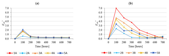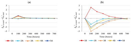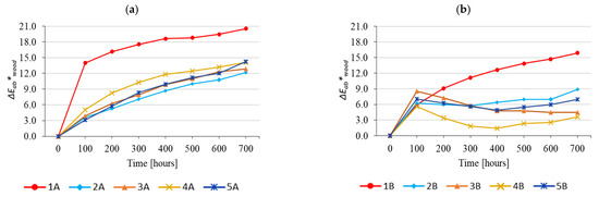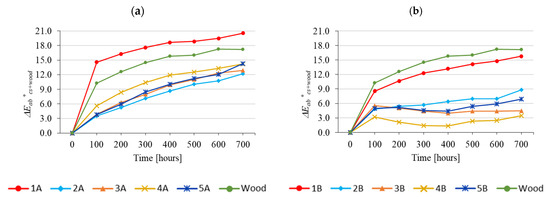 In the case of wood surface-treated with CSs, with lignin stabilisers, more significant differences were observed, especially during the first 300 accelerated ageing hours (Figure 14b). The colour variation of wood surface-treated with coating system without UV absorber (1B) was more intensive than the colour variation of the substrate. After 100 ageing hours, this difference was above 2 (visually detectable), expressed according to the scales reported [37,38]. With increased ageing, this difference reduced significantly after 600 ageing hours, reaching practically zero (Figure 14b).