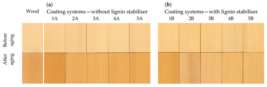 Accelerated-ageing-induced effects on ΔE of the wood substrate covered with tested coating systems at accelerated ageing process: (a) without lignin stabiliser and (b) with lignin stabiliser.