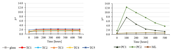 The course of the individual colour coordinates during the ageing process was almost the same as the course of the coordinates in Figure 5. This confirms that the discolouration of wood surface-treated with the tested transparent CSs was mainly caused by the substrate discolouration, i.e., the discolouration of the spruce wood. Our results are broadly consistent with the results of previous research [22,24,28], although several differences were observed. The cause can be assigned to the different coating materials, as well as differences in the modifications and methods used.
