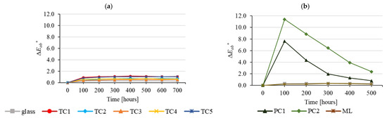 Value of colour difference, ΔE, detected for the tested coating materials applied on glass, in different phases of the ageing process: (a) top coating and (b) middle layer and primer base (abbreviations as in Figure 8).