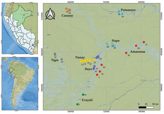 Geographical locations of the eight river basins in the Peruvian Amazon where INIA germplasm bank accessions of M. dubia were collected from wild populations. Each river basin is represented by a different color, with the Cuaray River basin in orange, the Tigre River basin in gray, the Itaya River basin in purple, the Nanay River basin in yellow, the Napo River basin in turquoise, the Amazonas River basin in red, the Putumayo River basin in blue, and the Ucayali River basin in green. The circles with numbers correspond to the accession numbers for the samples collected from those sites.