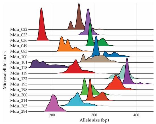Allele size distribution of sixteen polymorphic SSR markers used for assessing genetic diversity and constructing the core collection of the M. dubia germplasm bank from the Peruvian Amazon. Each color represents the size variation and relative abundance of a specific SSR marker.
