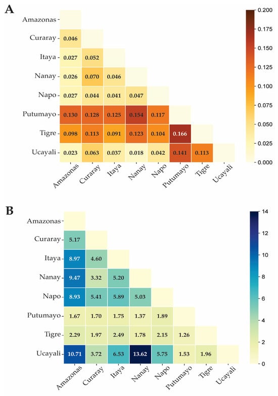 The gene flow (Nm), measured as the number of migrants per generation between individuals of the same river basins, was estimated (Figure 3). The higher the value of Nm, the more intense the gene flow between populations, opposing genetic differentiation. The values of Nm ranged from 1.26 to 13.62 in this study, indicating a moderate gene flow among river basins. Itaya and Ucayali had the highest gene flow, with Nm = 13.62, indicating that there had been a high degree of genetic exchange between these two populations. Other high values of Nm were between Amazonas and Ucayali, with an Nm of 10.71; between Nanay and Amazonas, with an Nm of 9.47; and between Itaya and Amazonas, with an Nm of 8.97. In contrast, the river basins of Putumayo presented low values of Nm against all others. The lowest value was noticed between Putumayo and Tigre, where Nm = 1.26, pointing to a very low rate of gene flow between these populations. In the same way, low Nm values were recorded between Putumayo and Nanay, Putumayo and Ucayali, and Putumayo and Amazonas, with values of 1.37, 1.53, and 1.67, respectively. In general, the Nm values indicated that, in fact, there is fairly high gene flow between several river basins, mostly between Amazonas, Itaya, Nanay, and Ucayali, responsible for keeping genetic connectivity. However, low gene flow detected among Putumayo and with other river basins, particularly Tigre, indicated restricted genetic exchange that adds up to the genetic differentiation observed.