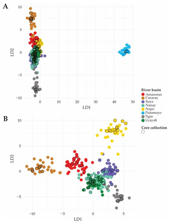 The results indicated that the plant genotypes from the Putumayo, Curaray, and Tigre River basins could be separated from the rest to fall into two distinct main groups. Figure 3A clearly allows the separation to be seen in this scatter plot, underlining the different genetic profiles of these river basins. Even if the other remaining plant genotypes from the other river basins do not have complete differentiation, this already hinted at substantial genetic connectivity among the other river basins, particularly the Itaya, Nanay, Amazonas, Napo, and Ucayali.