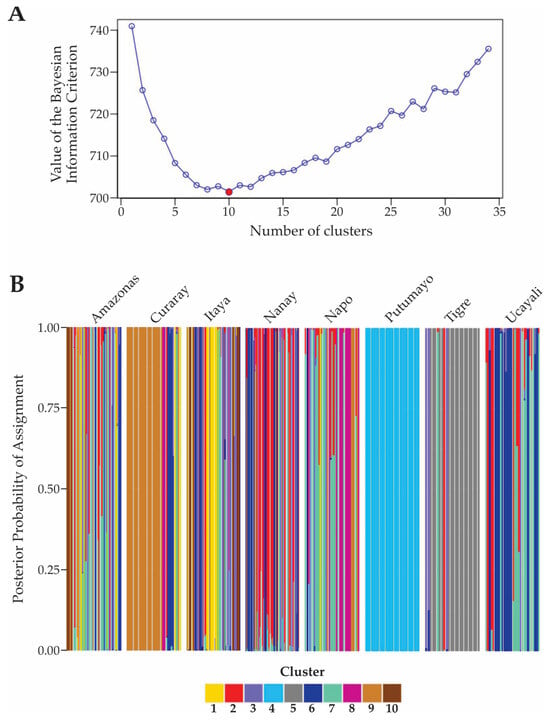 Figure 5B depicts the results, in bar plots, of the posterior probability of the assignment, for each river basin, of the individual plant genotypes to the ten genetic clusters identified. The results exhibited a complex genetic structure, with different degrees of admixture of the analyzed M. dubia germplasm accessions from eight river basins. Germplasm accessions from the Amazonas, Itaya, Nanay, Napo, and Ucayali River basins showed some degree of admixture; that is, plant genotypes were assigned to multiple genetic clusters. Those germplasm accessions derived from the Tigre and Curaray River basins displayed moderate grades of admixture, mostly being assigned to clusters 5 (gray) and 9 (light brown), respectively. In sharp contrast to this, germplasm accessions from the Putumayo River basin did not show any admixture, in which all of the plant genotypes are classified in genetic cluster 5 (light blue). These findings give evidence regarding the complex genetic structure and variable levels of admixture present in the eight river basins and their corresponding germplasm accessions of M. dubia.