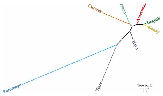 Based on Nei’s genetic distances, the neighbor-joining tree provided insights into the genetic relationships and divergence among germplasm accessions from the eight river basins in the study area, as depicted in Figure 6. Tree topology revealed two main genetic clusters that would suggest the existence of distinct evolutionary lineages. One large cluster comprised the Curaray, Napo, Amazonas, Ucayali, Nanay, and Itaya River basins, thus indicating their genetical proximity and therefore higher historical gene flow rates among these river basins. Their close genetic relationships among these six river basins agree with the high admixture levels observed in these populations. Larger genetic distances of the second major cluster, including that of the Putumayo and Tigre River basins from all others, suggest their independent genetic background and reduced admixture. The results underline the complex genetic structure and heterogeneous genetic connectivity among plant genotypes of M. dubia in the different river basins.