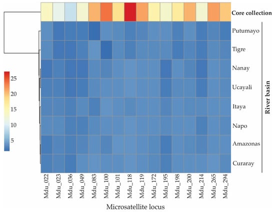 Heatmap depicting the allelic richness of a core collection from the M. dubia germplasm bank in the Peruvian Amazon based on sixteen polymorphic SSR markers.
