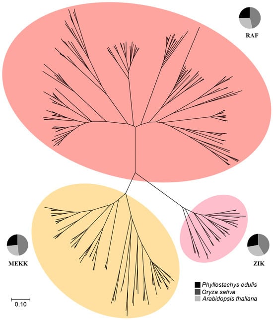 To examine the evolutionary relationships among the MAPKKKs in moso bamboo, rice, and Arabidopsis, a phylogenetic tree was built by the neighbor-joining (NJ) method (Figure 1). The analysis showed that PeMAPKKKs were classified into three clades: MEKK, ZIK, and Raf, which was consistent with the AtMAPKKKs and OsMAPKKKs [8,12]. The quantitative distribution of each clade of MAPKKKs is shown in Table S4. Among these subfamilies, the Raf subfamily has the most genes, containing 79 PeMAPKKKs, 48 AtMAPKKKs, and 43 OsMAPKKKs. There were 40 PeMEKKs, 21 AtMEKKs, and 22 OsMAPKKKs grouped in the MEKK subfamily, while 15 PeZIKs, 11 AtZIKs, and 10 OsMAPKKKs grouped in the ZIK subfamily. The gene number of moso bamboo was much greater than that of rice and Arabidopsis, suggesting that the MAPKKK gene family may undergo significant tandem duplication in evolution, leading to tetraploid moso bamboo possessing more MAPKKK genes. Some orthologs of MAPKKKs between moso bamboo and rice have obtained, implying that some ancestral MAPKKKs existed before the divergence of moso bamboo and rice.