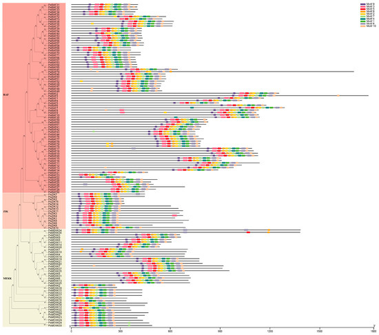 Phylogenetic relationships (the left) and motif distributions (the right) of PeMAPKKKs. Scale bar: 300 amino acids.