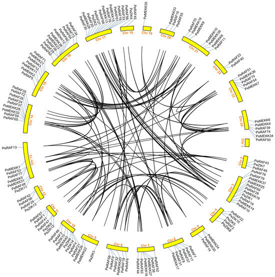 Chromosome distribution and syntenic relationships of PeMAPKKKs. The PeMAPKKK gene pairs are connected by black lines.