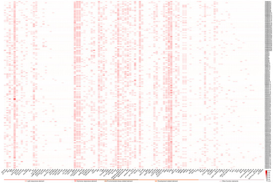 The sequences (2000 bp sequence upstream of the translational start codon) of promoters were submitted to PlantCARE (v1.0) (http://bioinformatics.psb.ugent.be/webtools/plantcare/html/, accessed on 25 June 2024) to analyze cis-regulatory elements in PeMAPKKK promoter regions. The cis-regulatory elements on PeMAPKKK promoters were summarized and counted, and then visualized using the TBtools software (v2.127) (Table S2) [29].