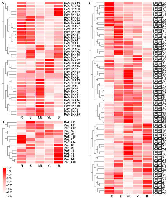 Heatmaps of PeMAPKKK expression in roots, stems, mature leaves, young leaves, and bamboo shoots. The levels of PeMAPKKKs in MEKK, ZIK, and Raf groups (A–C) are shown with different colors.