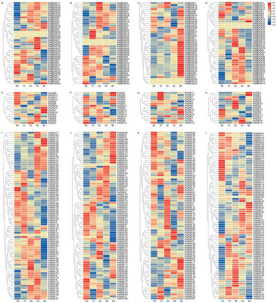 Heatmaps of PeMAPKKK expression in MEKK, ZIK, and Raf groups under NaCl (A,E,I), PEG (B,F,J), cold (C,G,K) and ABA (D,H,L) treatment. The levels of PeMAPKKKs are shown with different colors.