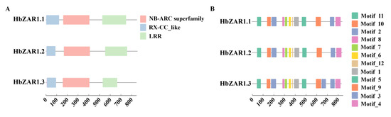 The conserved structural domains and motifs of the HbZAR1 proteins. (A) The functional domains of the HbZAR1 proteins. The three HbZAR1 proteins contain the structural domains RX-CC_like, NB-ARC, and LRR. The domains are displayed in different kinds of colored boxes. (B) The motif’s analysis of HbZAR1 proteins. The HbZAR1 protein has 12 motifs. The motifs are displayed in different kinds of colored boxes.
