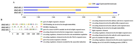 Gene structure and putative promoter cis-acting elements of HbZAR1s in rubber tree. (A) Gene structure analysis of HbZAR1s. Exons are shown by yellow rectangles; upstream/downstream are shown by blue rectangles. (B) Distribution of cis-elements in the promoters of HbZAR1 genes. A total of 19 types of cis-acting elements were predicted from the HbZAR1 gene promoter sequences. Putative cis-elements are represented by different colored boxes.