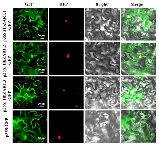 The pCAMBIA1300 vector carries the 35s×2pro strong promoter and GFP tag, enabling transient expression of the target gene and emitting green fluorescence signal under specific excitation light within a specific range, chosen for use in the subcellular localization study of the HbZAR1s. The target fragment of HbZAR1 genes was cloned from rubber tree leaf cDNA as template, and the linear vector was obtained by double cleavage of the vector with KpnI and XbaI restriction endonucleases. The HbZAR1-coding sequence was constructed into pCAMBIA1300 vector by homologous recombination. Sequencing was performed using Sangyo Bioengineering (Shanghai) Co. Then, the empty and positive cloned recombinant vector was transformed into Agrobacterium tumefaciens GV3101 using heat-excited methods, respectively. The positive PCR test was continued until OD600 = 0.8, and the organisms were collected. The bacteria were washed, and then the OD600 = 0.6 was adjusted with the infestation solution (10 mmol L−1 MES, 10 mmol L−1 MgCl2, 150 μmol L−1 acetosyringone). In addition, an H2B-mCherry vector was selected as a nucleus marker. Tobacco leaves aged 3–4 weeks with consistent growth are selected, and the recombinant vector liquid is aseptically aspirated from the leaf backside into the plant using a sterile syringe. After injection, the plants are kept in the dark for 12 h, then maintained normally for 48 h before the leaves are harvested and observed for green- and red-fluorescence signals under excitation light at a wavelength of 488 nm and 543 nm using laser-scanning confocal microscopy (Zeiss LSM 880 0, Jena, Germany) [41].