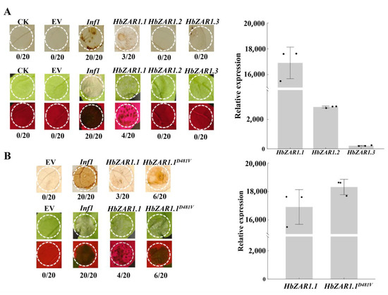 The HbZAR1 gene ROS Burst and Cell Death. (A) Phenotype of CK, EV (Empty vector), Inf1 (Positive control), HbZAR1.1, HbZAR1.2 and HbZAR1.3 triggered ROS and cell death in N. benthamiana. The three HbZAR1 genes do not induce stable ROS and cell death. (B) Phenotype of EV, Inf1, HbZAR1.1 and HbZAR1.1D481V (Activate mutant) triggered ROS and cell death in N. benthamiana. HbZAR1.1 and HbZAR1.1D481V do not trigger stable ROS and cell death phenotypes. Indicated genes were transiently expressed in N. benthamiana leaves via agroinfiltration. ROS- and cell-death-representative leaves were photographed 2 d and 3 d post-agroinfiltration. CK is the blank control, EV is the empty vector, and Inf1 is the positive control. The number of leaves showing the phenotypes (numerator) and that of total surveyed leaves (denominator) were indicated by numbers at the bottom. The relative expression level of the gene was validated by RT-QPCR after agrobacterium infiltration, with EV treatment as the control. The black dot represents different experimental replicates.
