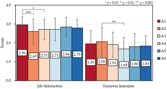 Mean and variance analyses were conducted to determine whether job satisfaction and turnover intention differed based on work characteristics (Figure 3, Table A3).
