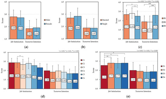 Analysis results of job satisfaction and turnover intention according to socio-demographic characteristics: (a) gender; (b) marital Status; (c) highest educational attainment; (d) age; (e) personal monthly income.