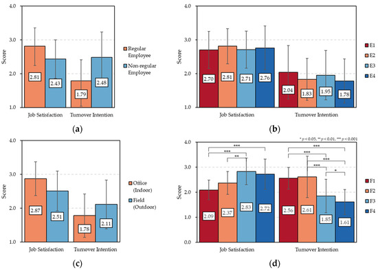 Analysis results of job satisfaction and turnover intention according to work characteristics of forest industry workers: (a) employment type; (b) tenure at current workplace; (c) workplace location; (d) number of working days.
