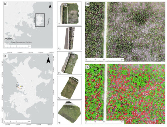 Experimental site: (a) Location of the study site; (b) Location and distribution of 5 plots (different colored points represent different sample plots); (c) Example of an UAV image in the study area, illustrated using RGB bands; (d) Example of manually delineated live and dead C. equisetifolia tree crowns (live trees are marked in green, dead trees in red).