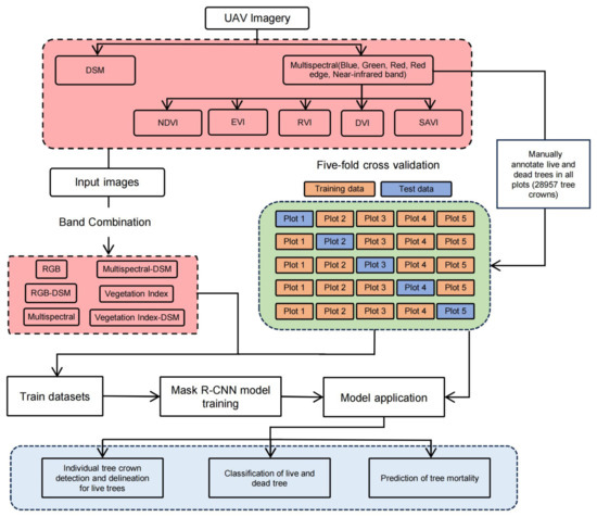 Research flowchart for this study. The light red color represents the products derived from UAV imagery. The light blue color represents the application of the Mask R-CNN model. The light green color represents a five-fold cross-validation.