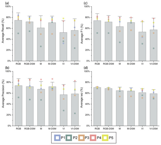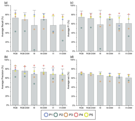 Average accuracy of individual tree crown detection and delineation for live and dead trees using different input images. The different colors of the scatter plots represent different sample plots. (a) Recall for different sample plots; (b) Precision for different sample plots; (c) F1 score of different sample plots; (d) IoU for different sample plots.