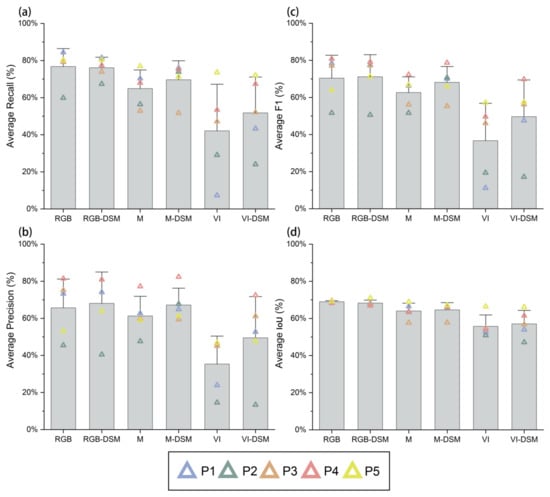 Average accuracy of individual tree crown detection and delineation for dead trees using different input images. The different colors of the scatter plots represent different sample plots. (a) Recall for different sample plots. (b) Precision for different sample plots. (c) F1 score of different sample plots. (d) IoU for different sample plots.