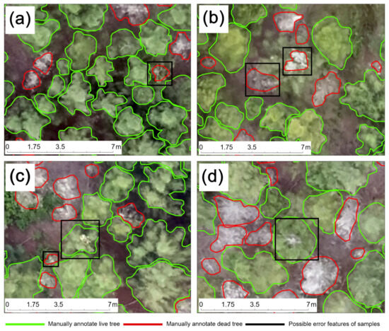 The manually annotated living and dead tree crowns may have erroneous features due to overlapping crown conditions. (a,b) Dead tree crowns may contain features of live tree crowns. (c,d) Live tree crowns may contain features of dead tree crowns.