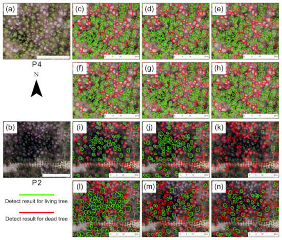 where MDLT is the model detection results on live trees, MDDT is the model detection results on dead trees, MALT is the manually annotated live trees, and MADT is the manually annotated dead trees. TMR represents the tree mortality rate.