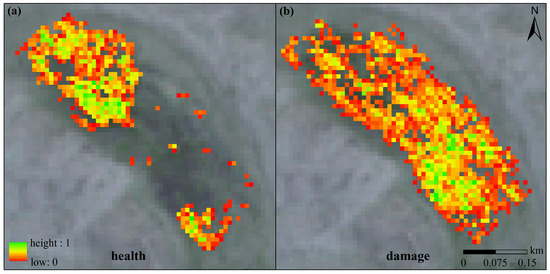 - Element-based multispectral simulation of Sentinel-2A imagesOn the basis of the reflectance extraction results for healthy and damaged larch, the reflectance values were simulated separately via the sample-based multispectral reflectance simulation model. Then, with the information for healthy () and damaged () larch, the reflectance of each waveband () of image elements was calculated; notably, the reflectance of healthy forest () and damaged forest () elements simulated with the algorithm was obtained with . obtained in this way can realistically reflect the reflectance of the larch canopy.