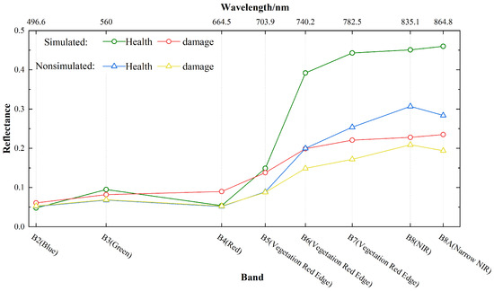 - When the simulated and nonsimulated spectral reflectance values of image elements were compared, the simulated spectral reflectance better reflected the spectral reflectance characteristics of the larch canopy, and the simulated spectral reflectance was more sensitive to larch damage than the nonsimulated spectral reflectance was. Compared with those in the case of nonsimulated spectral reflectance, the decreases in damaged larch in the green light, red edge, and near-infrared bands and the increase in the red light band in the case of simulated data were more significant, indicating that the simulated values were more sensitive to changes in the larch canopy.