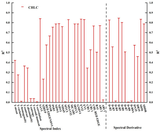 - Spectral sensitivity characterizationTo analyze the correlations between SI and SDF and CHLC, the corresponding coefficients of determination, R2, were calculated. Then, an R2 threshold was selected, and screening was performed to select the sensitive SI and SDF. Next, the SPA algorithm was used to downsize these sensitive spectral features and obtain the spectral features used in the final modeling process.