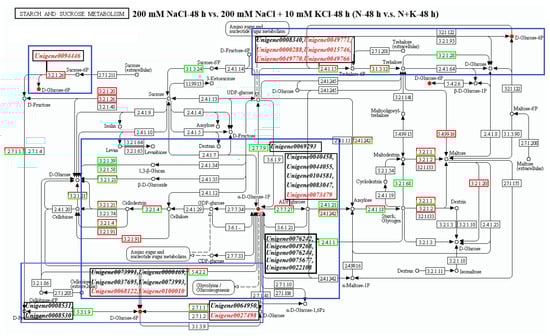 In the comparison group of 200 mM NaCl-168 h vs. 200 mM NaCl + 10 mM KCl-168 h (N-168 h vs. N + K-168 h), 59 DEGs are enriched in the starch and sucrose metabolism pathway. Of these, 13 are upregulated and 46 are downregulated (Figure 2). Eight trehalose-related genes are annotated, namely Unigene0021959, Unigene0010526, Unigene0074391, Unigene0001622, Unigene0091673, Unigene0015746, Unigene0015747, and Unigene0049766. However, only 5 of these (Unigene0001622, Unigene0091673, Unigene0015746, Unigene0015747, Unigene0049766) regulate the metabolite (D-Glucose 6-phosphate). Except for Unigene0091673, which is downregulated in the N-168 h vs. N + K-168 h group, the other 4 trehalose-related genes are upregulated.