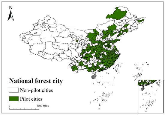 Although existing studies have explored the ecological effects of urban forests, they have mainly focused on the impact of NFCs on haze pollution, carbon dioxide emissions, and green coverage. Xu et al. explored the impact of NFCs on UER, but they mainly focused on the differences of this impact in different urban agglomerations and did not address the intrinsic mechanisms and the spillover effects on neighboring cities [], which our study can complement. China began to build NFCs in 2004, and as of 2021, there are 193 NFCs in the country. As shown in Figure 1, the distribution of the NFCs basically covers the eastern, central, and western regions of China. There are significant differences in economic development, resource endowment, and technological innovation, which ensures the representativeness of the samples in NFCs and provides a good opportunity for us to use the difference-in-difference method.