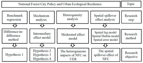 where M represent the mediating variables; if is significant, it means that NFCs can enhance UER through the mediating variables. In addition, we use the moderated effect model to analyze the heterogeneous effects of NFCs on UER and use the spatial spillover effect model to analyze the spillover effects of NFCs on the ecological resilience of neighboring cities, and the method used in this paper is shown in Figure 2.