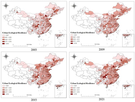 We use ArcGIS to map the ecological resilience of 292 cities in China in 2003, 2009, 2015, and 2021 (Figure 3). As can be seen from Figure 3, there is an obvious spatial clustering phenomenon in the UER in each period, and the cities with higher ecological resilience in 2003 are mainly concentrated in East China and South China, while the overall UER is at a relatively low level. However, with the passage of time, the UER in 2015 increased significantly, indicating that China’s UER has achieved remarkable results. In 2021, the overall UER is further improved, and cities with higher ecological resilience are mainly located in the Beijing–Tianjin–Hebei urban agglomeration, the Yangtze River Delta urban agglomeration, the Chengdu–Chongqing urban agglomeration, and the Pearl River Delta urban agglomeration.