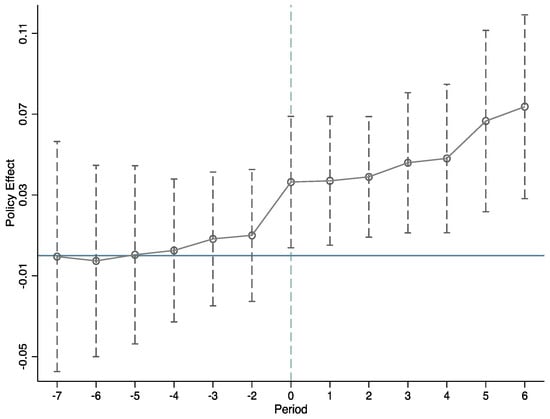 Prior to the establishment of the NFCs, we examined whether the trends in UER changes in the treatment and control groups are consistent to ensure that the modeling application satisfies the parallel trend assumption. We use the year before the establishment of the NFCs as the base period and close the observations at both ends of the window period outside the window period, to test the dynamic trend change in UER from 7 years before to 6 years after the establishment of the NFCs. The specific results are shown in Figure 4. Before the establishment of the NFCs, the dynamic effects of the policy are not significantly different from 0, indicating that there is no significant difference in the trends of UER changes between the treatment group and the control group, which satisfies the parallel trend assumption. After the establishment of the NFCs, the policy dynamic effects are significantly positive, and the policy dynamic effects gradually increase over time.