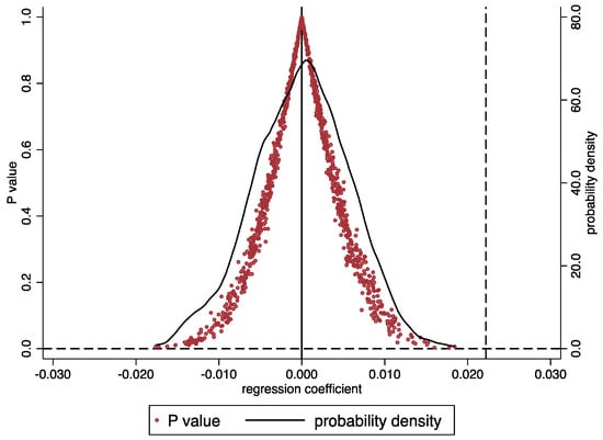 If the results of the baseline regression are plausible, then new event shocks do not significantly affect the UER with randomly set treatment groups. Based on this, this study conducts a placebo test by randomly generating treatment groups. Specifically, each sample is given a randomized policy time, and to avoid the interference of small probability factors on the estimation results, this study conducts 1000 random draws. The kernel density distribution of the estimated coefficients is shown in Figure 5. Figure 5 shows that the mean value of the pseudo-regression coefficients in the placebo test is close to 0, which indicates a large gap from the true estimates of the explanatory variable, and the p-value of the vast majority of the estimated coefficients is greater than 0.1, indicating that the estimation results have a high degree of confidence.