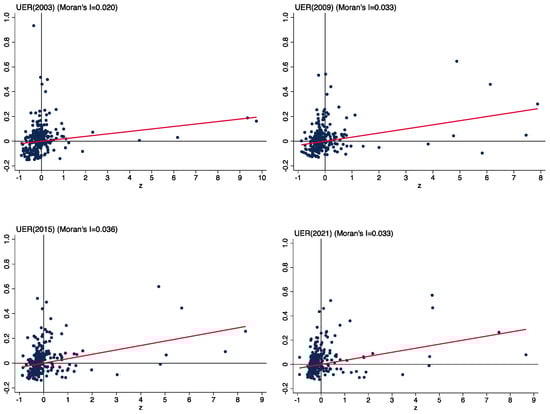 To examine the regional spatial characteristics of UER, we further conduct local correlation tests. To depict the spatial distribution of the UER, we use data from 2003, 2009, 2015, and 2021 to create scatter plots using the local Moran’s index. Figure 6 shows that most urban samples are located in quadrants 1 and 3, while a small number of samples are found in quadrants 2 and 4. This indicates that the spatial distribution of UER exhibits “high-high” and “low-low” clustering, demonstrating clear spatial clustering characteristics.