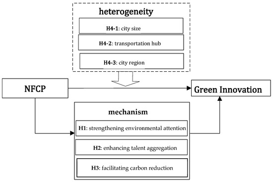 The remainder of this paper is structured as follows. Section 2 presents the theoretical analysis and research hypotheses, exploring the mechanisms through which the NFCP influences green innovation and proposing relevant hypotheses. Section 3 details the research design, including data sources, variable construction, and model specification. Section 4 conducts an empirical analysis, presenting the regression results of the policy’s impact on green innovation along with robustness tests. Section 5 examines the mechanisms of the policy’s effects. Section 6 analyzes the heterogeneity of the policy’s impact. Finally, Section 7 provides conclusions and policy recommendations, offering suggestions for optimizing the policy based on the empirical findings.