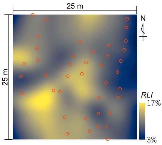 To estimate the light intensity at each sapling point, hemispherical images were captured using a digital camera (D5000, Nikon, Tokyo, Japan) equipped with a fisheye lens (4.5 mm F2.8 Ex DC Circular Fisheye HSM, Sigma, Kawasaki, Japan). The minimum distance between the hemispherical images was approximately 2 m (Figure 1). The images were captured on a cloudy day. The photography direction was fixed, and the camera height (position of the fisheye lens) was set as the height of each sapling. The camera was set to an aperture of f = 8.0, ISO sensitivity of 200, and a shutter speed of 1/250. Subsequently, the relative light intensity at each sampling point throughout the growing season for saplings, spanning from April 1 to October 31, was computed using LIA 32. The total light intensity during this period was theoretically derived using LIA 32 based on the plot’s positional information, and the relative light intensity (RLI) at each sampling point was subsequently determined. The spatial coordinates of each sampling point were measured using a laser rangefinder (TruPulse 360R; Laser Technology, Centennial, CO, USA). Next, using ArcGIS Pro 2.9.2 (Esri, Redlands, CA, USA), the spatial variation in the RLI within a plot was visualized from the sampling locations and RLI measurements at the sampling points. Finally, the RLI variation between each sampling point was calculated via interpolation and extrapolation by using the spline method within the Spatial Analyst extension package.