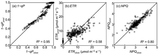 Relationships between predicted and observed values of (a) 1−qP, (b) ETR, and (c) NPQ. Data points are represented by gray circles, which darken as they overlap.