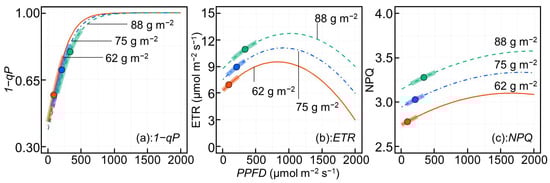 Equation (6) was formulated as a logistic equation because the maximum value of 1−qP is one, and a saturation trend with increasing PPFD was anticipated. Conversely, Equations (9) and (12) were modeled as quadratic equations because the ETR is reported to increase with the PPFD up to a certain point and then decrease [], and the NPQ was expected to exhibit a similar trend. Additionally, interaction terms were included in Equations (6), (9) and (12) to determine whether the response of each photosynthetic parameter to the PPFD varied with the LMA. The range of LMA values used in the model was 55.0–134.6 g m−2.