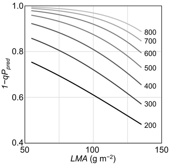 Relationship between 1−qPpred, calculated from the parameters estimated by Equations (4)–(8), and LMA. The numbers (200–800) within the graph indicate the PPFD (μmol m−2 s−1). The range of LMAs was set to match the range used in the model (55–135 g m−2).