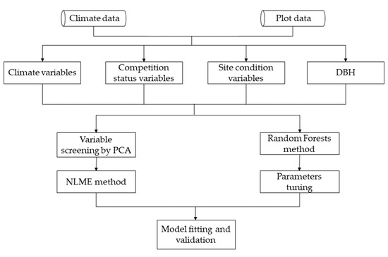 The workflow employed in this study to quantify the tree heights using NLME method and Random Forest method.