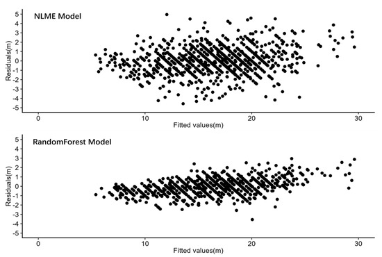 The residual plots of the finally fitted NLME model and the Random Forest model are shown in Figure 2. The results showed that the scatter points were randomly distributed on both sides of the 0-axis. No obvious heteroscedasticity trend was observed for the NLME model. There was an obvious trend in the lower graph, where the residuals in the Random Forest model were not uniformed distributed. The Random Forest model had a better predictive ability, and the scatter points were more closely distributed.