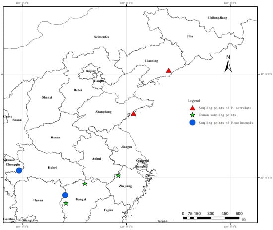 Field samples were collected between 2018 and 2020, comprising a total of 341 individuals from naturally occurring provenances in good growth states across 6 provinces and 7 cities, including 110 samples from 5 P. serrulata populations and 231 samples from 8 P. xueluoensis populations. The P. xueluoensis populations from Qingliang Feng in Zhejiang, Lushan in Jiangxi, and Mingyue Shan in Jiangxi were divided into two sections based on higher and lower altitudes.